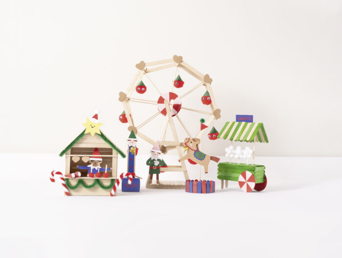 4. Klebe die Figuren mit Klebestift und 3D-Klebepads zusammen. Nimm dafür die Grafik und das Foto zur Hilfe oder werde selbst kreativ! Klebe z.B. die Zitronen oder die Eiskugeln mit 3D-Klebepads fest, um den tollen 3D-Effekt zu erzielen. / Glue the figures together using glue stick and 3D adhesive pads. Use the graphic and photo to help you or get creative yourself! For example, glue the lemons or the scoops of ice cream with 3D adhesive pads to achieve a great 3D effect.